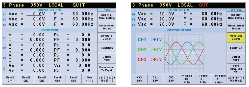 Chroma 61500系列可编程交流电源供应器内建16bit的类比/数位转换器的量测线路,搭配快速运算的韧体,可提供量测各种参数,包括真实的RMS电压、RMS电流、实功率、功率因素、VA (视在功率)、峰值电流、波峰因素等;而透过先进的DSP技术,Chroma 61500系列产品能测量输出的总谐波失真(THD)及多阶电流谐波成份数值,并可透过屏幕以Waveform Viewer功能直接显示输出电压及电流波形。