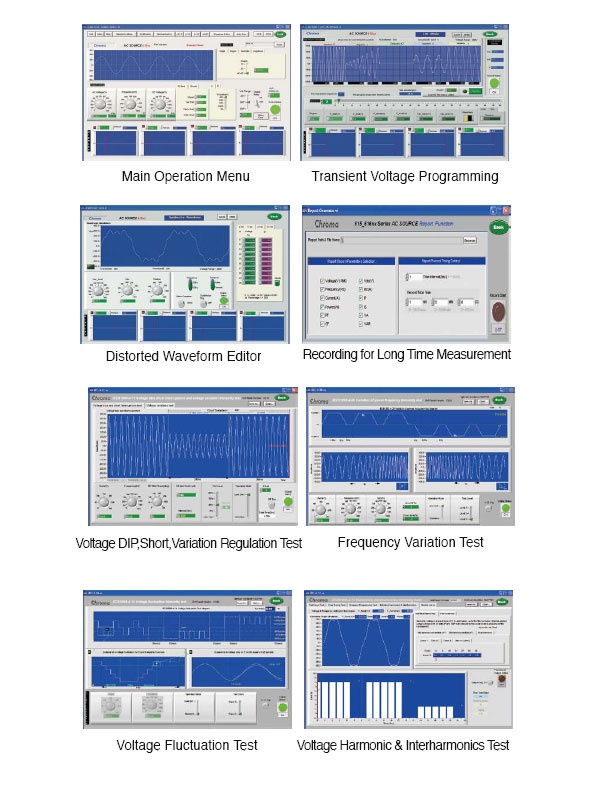 Chroma 61503可编程交流电源提供图形化接口的控制软件, 提供简易设定及操作, 可执行所有的功能. 并内建测试法规. 并可以长时间记录量测值, 存成档案供分析。