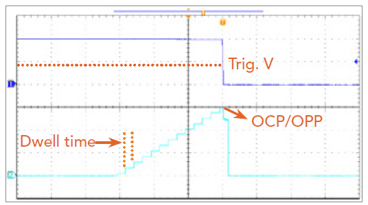 电源设计时,为确保使用者的安全及降低电源的损坏率,过电流保护或过功率保护机制往往是需要被考虑与设计,63200A的过电流与过功率测试,可提供使用者自行设定步阶电流或步阶功率来进行电源的过电流或过功率保护测试,并于电子负载判定此测试结果为Pass或Fail,测试过程中的最大功率值(Pmax),亦能自动撷取并显示于显示器上,能帮助使用者不透过示波器即可验证所设计的过电流与过功率机制是否正确,更可为使用者减少许多测试时间。
