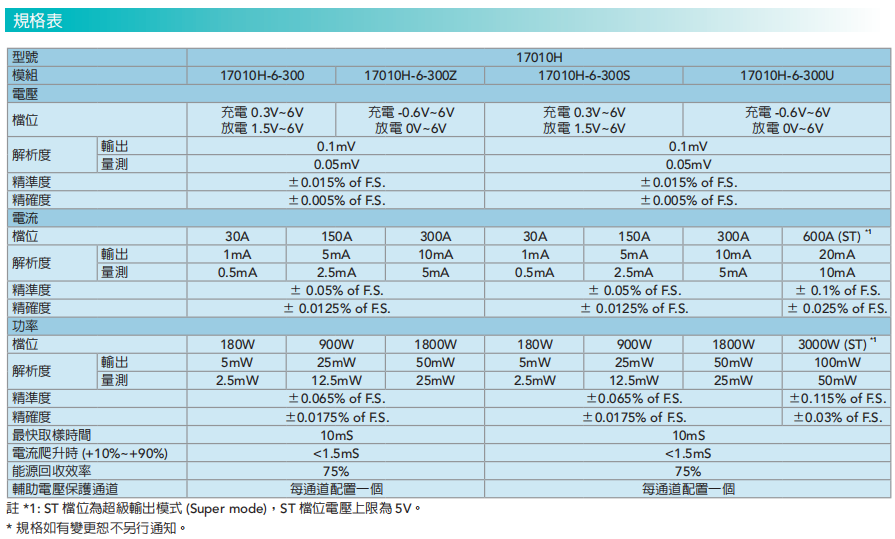 17010H采用能源回收电路构架,不同于传统开关式电源设备,具备高测量精准度/精确度、高速电流响应、充放电转换零交越时间、多电流量程等特点,能够帮助电池芯实验提高电容测量试精准度、性能参数辨证以及更拟真的动态电流与功率测试;此外,17010H具备200%脉冲电流输出功能,单通道连续电流为300A,可提供600A的30S脉冲测试电流,有利于功率能力与直流内阻测试此类需要短时间且高倍率测试电流之实验,可节省设备购置成本。