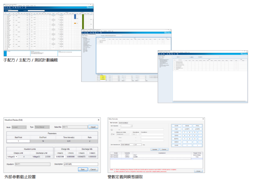 阶层式编辑构架(测试计划→主配→子配方),可将现有配方透过替换测试物规格直接共享测试、或是透过弹性组合既有子配方来快速建立完整计划,以及创建新配方来满足各类型充放电测试应用。
