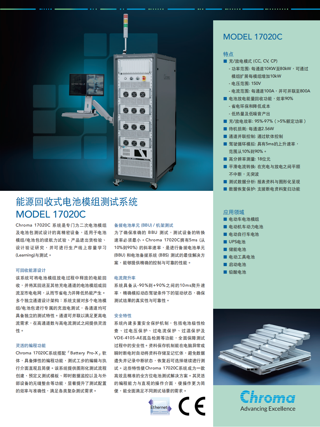 Chroma 17020C系统是专门为二次电池模组及电池包测试设计的高精密设备,适用于电池模组/电池包的续航力试验、产品进出货检验设计验证研究,并可进行生产线上容量学习(Learning)与测试。