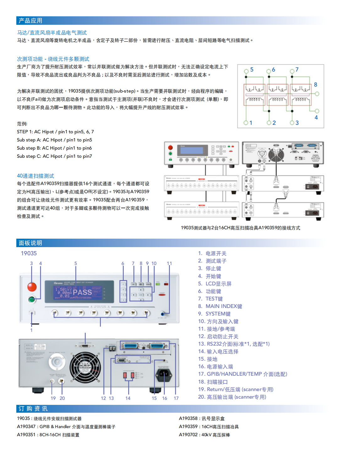 Chroma 19035绕线元件电气安规扫描测试器针对马达、变压器、加热器等相关绕线产品进行安规测试,让绕线元件厂商在品质验证测试时,不但拥有可靠的品质,能更有效率的为产品品质把关。