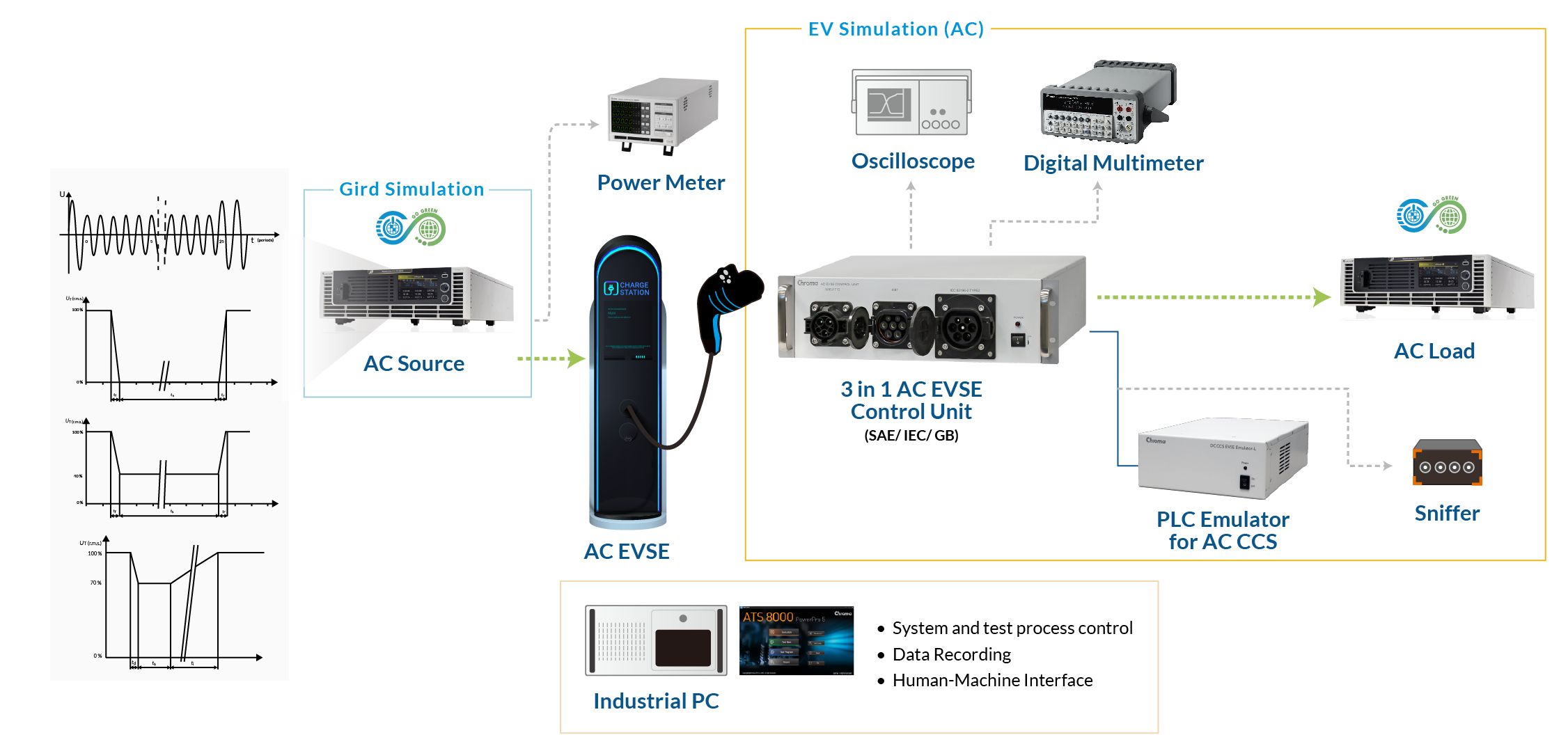 Chroma提供用户国际化的测试系统,利用Chroma 8000 ATS,实现全球各大标准测试,包含:SAE、CNS、NB/T、GB/T、IEC、ISO、DIN、CHAdeMO、NACS、ChaoJi、MCS等,协助用户将产品推向国际舞台。
