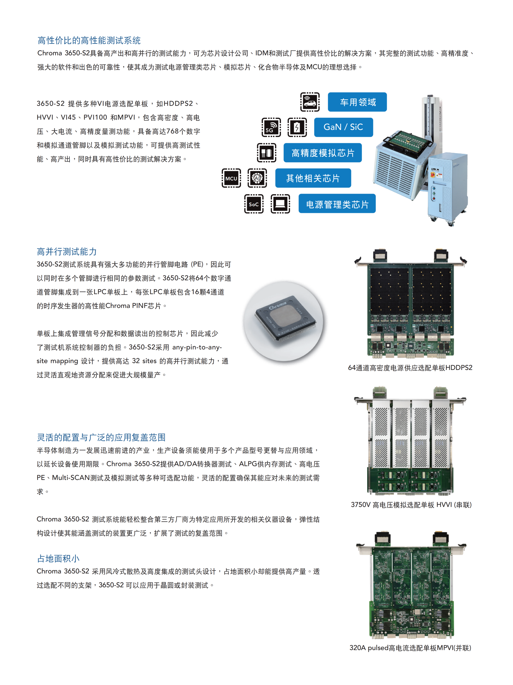 3650-S2测试系统具备完整的测试功能、高精准度、强大的软件和出色的可靠性,是测试高性能MCU、模拟芯片、消费性SoC的理想选择,同时,凭借高产出和高并行的测试能力,3650-S2可为芯片设计公司、IDM和测试厂提供高性价比解决方案。