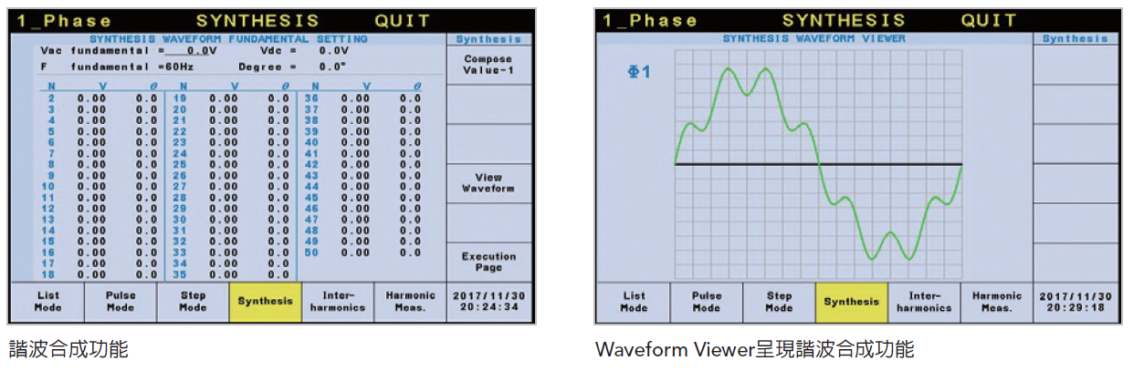 此外,Chroma 61500系列产品具备SYNTHESIS(合成)功能,允许使用者以50Hz或60Hz的基本频率来设定多阶的谐波成份,形成周期性的失真波形;另外61500系列产品亦提供INTERHAR(间谐波)功能,用于基频之外设定另一个非谐波的变动频率成份,从0.01Hz扫描到2400Hz,可帮助发现待测物输入端的谐振点或抗干扰的脆弱点。藉由以上特性,61500系列产品可输出周期性谐波和非周期性间谐波的失真波形,以完成IEC 61000-4-13符合免疫性测试。