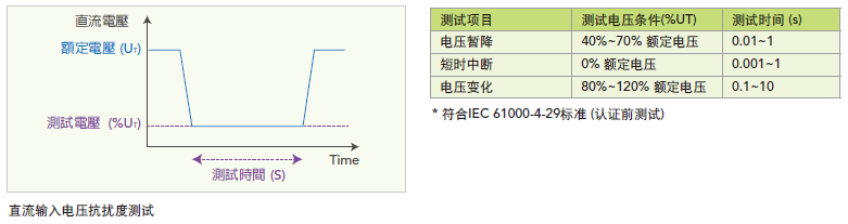 此外Chroma 61500系列产品能够模拟IEC 61000-4-29* Electromagnetic compatibility (EMC)-Part 4-29: Testing and measurement techniques- Voltage dips, short interruptions and voltage variations on dc input power port immunity tests法规对于直流电压暂降、短暂中断和电压变化测试条件(%UT) 如下表。