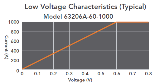 63206A-60-1000机型专门设计具有低电压拉载特性0.6V@1,000A,且低于0.6V至0V区间仍可拉载电流 (参考如低电压操作特性V-I曲线图)。此低电压操作特性适合用于测试中央处理器(CPU)与图形处理器(GPU)需求电压V-core,其电压范围约在0.6V~1.5V及电流范围约在400A~800A,另外也适宜于燃料电池及其他低压大电流应用。