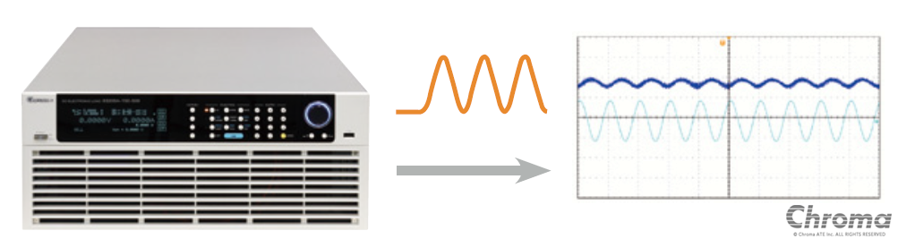 63200A系列具备正弦波拉载电流,可让使用者设定拉载电流偏压值(I_DC)、拉载正弦波(I_AC)及正弦波频率值(Frequency),此正弦波拉载的最低点不可小于零安培。此正弦波拉载电流功能可被应用在D/D及伺服器电源供应器与燃料电池的直流内阻(DCIR)测试上。