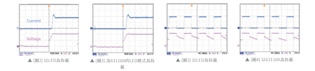 由图2与图3可观察到两者于LED driver于开机时的拉载电压电流波形非常相似。图4为测LED为负载在调光(Dimming)时的电流波形。图5为63110A为负载在调光(Dimming)时的电流波形。