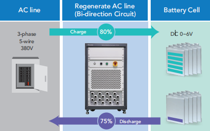 Chroma 17010H将电池芯放电时的电能回馈到交流电网取代负载消耗能量的方式,可降低大量废热产生,实现低碳排的绿能制造,降低配电需求、节省运转电力与空调成本。